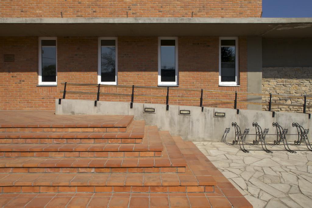 Az épület látszótégla burkolatú, kivéve az előbb említett oromfalat és kerítést, amelyek terméskőből készültek. A ház laposhajlású tetője fémlemez fedésű. A medenceterek fölötti tető egy egyszerű szerkesztésű ragasztott fa főtartókból álló szerkezet.