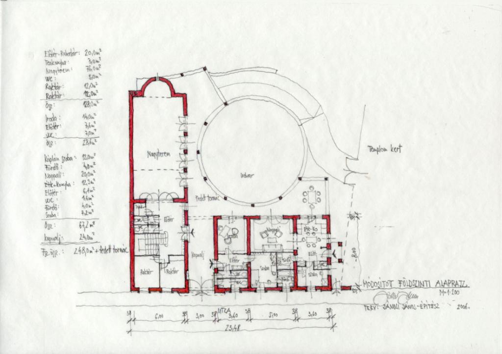 A fentebb vázolt szellemiség természetesen csak szinkronban működik a funkcióval, ha attól eltér nem ér semmit. A megadott és kívánt program az egyház és egyháztanács részéről teljesen bele illet a hagyományokba. Az utca fronton helyezkedik el az új parókia rész, egy káplán szoba, az iroda és az ügyfélforgalmat kiszolgáló vizesblokk. Az utcára is kinyúló másik szárnyrészben helyezkedik el egy karitatív iroda és raktár, egy aula (mely ruhatár, teakonyha és feljárat is egyben a tetőtérbe) és a gyülekezetei terem, melynél kifejezett igény volt a szakralitás (pl. keresztelők megtartása) is. Ez a rész közvetlenül kapcsolódik a kerengők mintájára kialakított udvarrészhez, hogy jó időben a létszámnak megfelelően bővíthető legyen a tér. A két szárny között helyezkedik el a kapuátjáró, ahonnan minden közösségi rész megközelíthető. (a parókiának nyugalmas, önálló bejárata is van az utca és templom kert felöl.) A tetőtérben egy hitoktatói család részére van lakás, egy egyháztanácsi külön terem és galéria a nagyterem befogadásának bővítésére. A vizes blokkokat úgy alakítottuk ki az emeleten, hogy ifjúsági programok esetén a hálózsákos alvás (galéria, esetleg különterem) esetén a zuhanyozási lehetőség biztosított legyen. A terepviszonyoknak megfelelően az épület hátsó részén, a pinceszinten alakítottunk ki 2 autónak garázst, raktárakat és a közösségi helyiségek kazánházát. Remélhetőleg az íves udvar és kert is szerves részévé válik az épületnek.