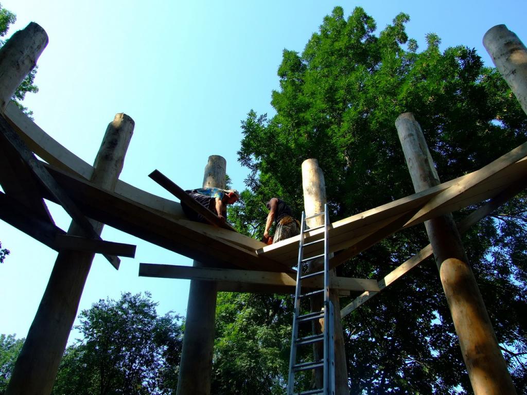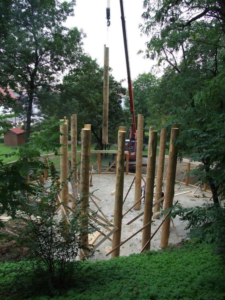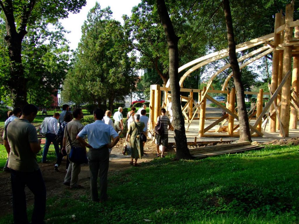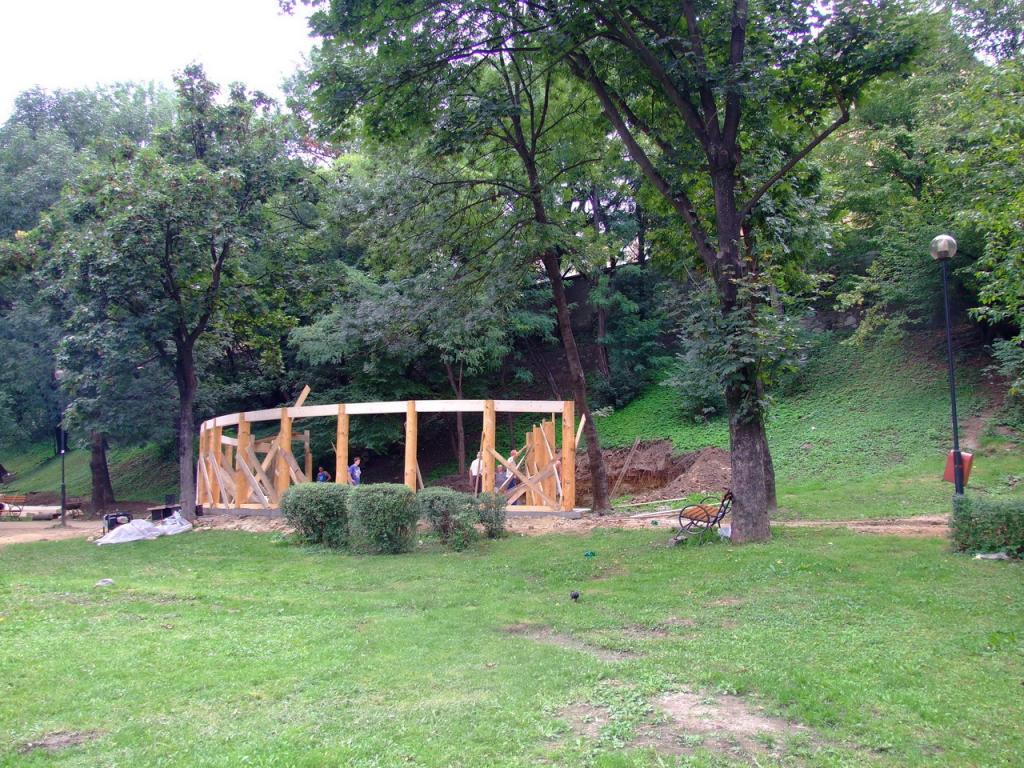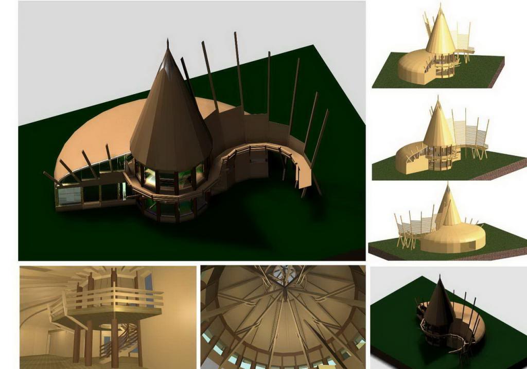 ''A kiállitó terem alapformáját egy kiforduló torony alkotja, szögét megtarva a kúpfelület kibomlik és átfordul, felfele nyitott forditott kúpfelületek keletkeznek. A felületeket alkotó gerendák a földről indulnak és egy hidszerkezetet alkotnak . Erre támaszkodik az emeleten induló galéria ami átvezet a kiállitó térből a domboldalon épitett instalációkhoz, egy iv mentén a park talán egyetlen nyirfája körül. A toronyban lévő lépcső visz fel az emeletre . A tetőt alkotó szarúfák a torony körül mindkét oldalon zsalus deszkaburkolatot kapnak az udvar körül csak a magasságuk egyharmadáig lesznek burkolva, a belső udvarban vetitésre is alkalmas felületet hozva létre. A gőmbsüveg szerkezetét ragasztott tartók alkotják kívűl belül deszkaburkolattal közötte hő és vizszigtelés.''-Részlet a pályázati műleirásból. A 2007-es rendezvényekre tervezett épitkezés előbb anyagi támogatás hiánya majd a telek tulajdonjogi helyzete miatt elakadt .Amennyiben a polgármesteri hivatal támogatja, lesz rá esély hogy folytatódjon .A szebenieknek rendszeres kulturális jelenlétet biztosithatna kiállitások, előadások, állandó helyszineként.